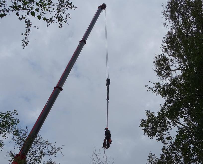 Bij de boomverzorger merk ik geen spoor van angst of twijfel. Er komt een hydraulische kraan met een arm die bijna in de wolken schuift. Nu volgt spektakel. De boomverzorger zekert zich aan de kabel en wordt langzaam bijna vijftig meter de lucht in getild… Hij zet daar kabels vast en zaagt de enorme stam door.
