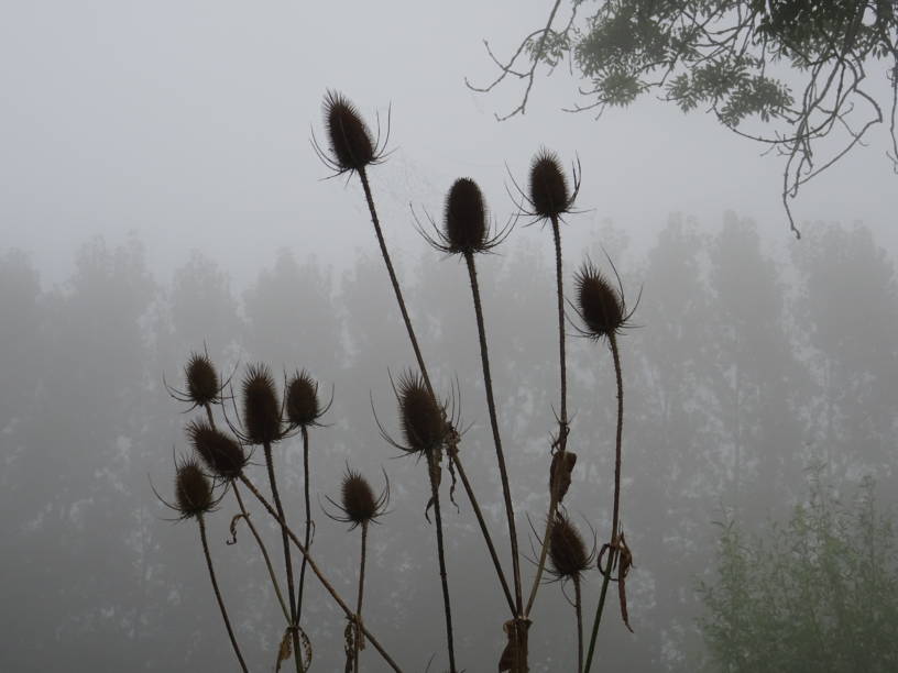 Een plant die ook in de winter blijft staan is de kaardenbol. Een tweejarige plant. Het eerste jaar is daar het bladrozet. Het jaar daarna gaat hij de hoogte in tot mensenlengte.