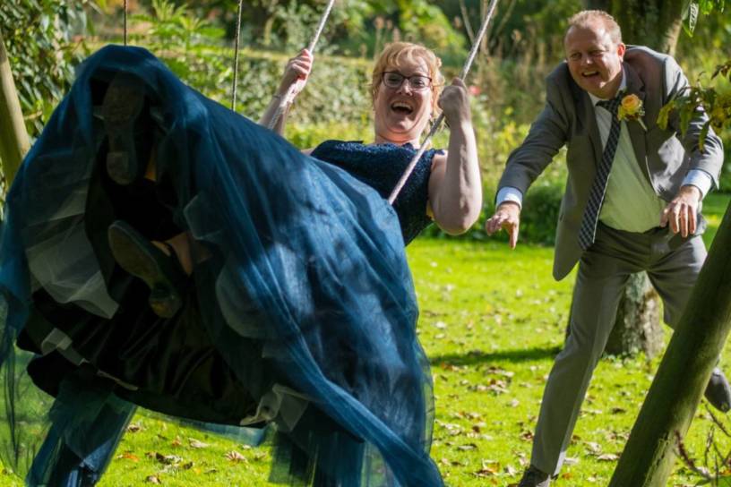Op de bewuste dag schijnt gelukkig de zon. Mooie foto’s worden geschoten. We zien liefde, blijdschap en de zon glimlacht mee. De mooiste foto vind ik die op de schommel. Het plezier spat er af. De schommel is mee verhuisd. Het maakt je altijd weer even dat schommelende kind van vroeger dat je nooit kwijt wil. Zeker niet op de grote dag van je huwelijk.