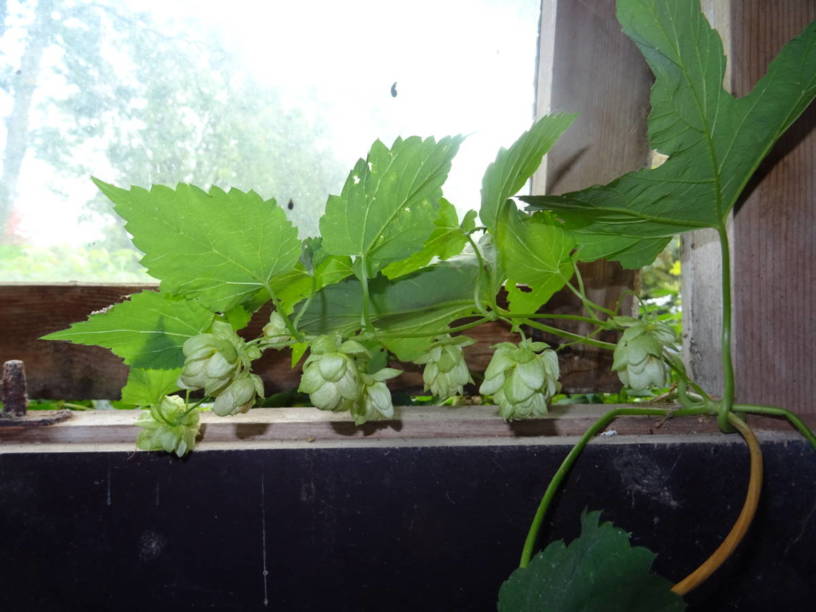 Het klapraampje van de stal staat een kiertje open. Het heeft zijn beste tijd gehad. Verf bladdert en het hout is verrot. De hop maakt dat niets uit. Met haar explosieve groei, tot wel 10 centimeter per dag, wurmt zij haar uitlopers naar binnen.