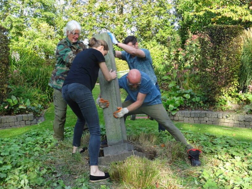 De eerste klus is het verplaatsen van een enorme sokkel. Ik graaf zijn voeten helemaal vrij maar hoe ik ook trek of duw, geen beweging in het beton te krijgen. De sokkel is onvermurwbaar. Ik geef me gewonnen en doe een beroep op mijn reservebank vol kracht; schoonzoons en dochters.