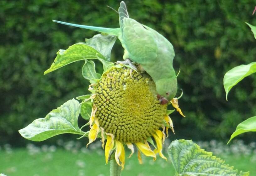 Opmerkelijk is dat je ze vooral tegenkomt in parken. Dat geldt hier ook met het park grenzend aan onze tuin. Ze annexeren nesten van holbewoners zoals spechten maar ze deinzen er niet voor terug de appelboom te plunderen en half aangevreten appels overal te laten liggen onder de boom. Dat trekt vervolgens ongewenste wespen. Daar zit niemand op te wachtten… Nu hebben de halsbandparkieten onze prachtige zonnebloemen ontdekt.