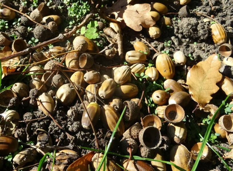 Wat is een mastjaar…? Het was zelfs onderwerp in het NOS-journaal. De tuin beantwoordt zelf de vraag. De grond onder de eik is bezaaid met eikels. Het kraakt onder mijn voeten als te dun ijs tijdens het schaatsen. De oorzaak is dat de bomen zoals eiken en beuken veel meer vrucht produceren dan gemiddeld door het groeizame weer.